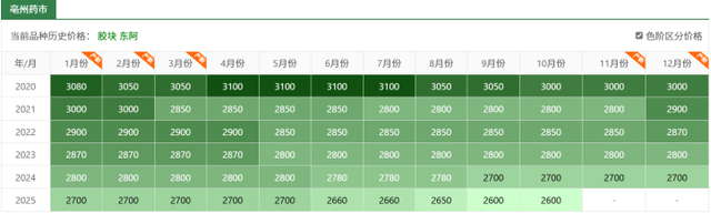 中药材天地网数据显示,2020年,亳州药市东阿阿胶的价格最高能达到3100元/公斤;而到了今年10月份,该产品价格下跌到了2600元/公斤。
