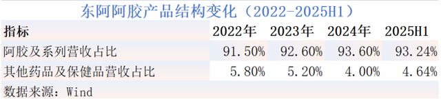 财报显示,2025年上半年,东阿阿胶阿胶及系列产品实现营收28.45亿元,占总营收比重高达93.24%,较2022年的91.5%进一步提升,产品结构单一化趋势加剧。