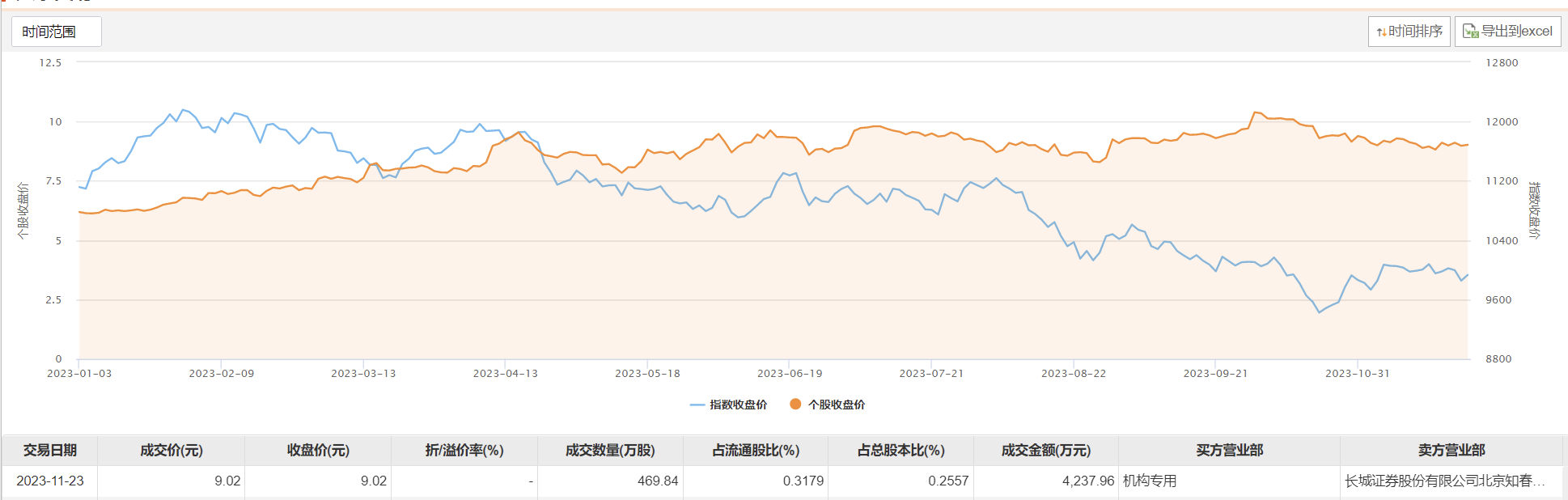 今日大宗交易成交469.84万股,成交额4237.96万元,占当日总成交额的38.68%,成交价9.02元,较市场收盘价持平。