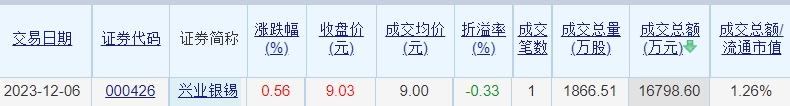 兴业银锡昨日大宗交易折价成交1866.51万股 成交额1.68亿元