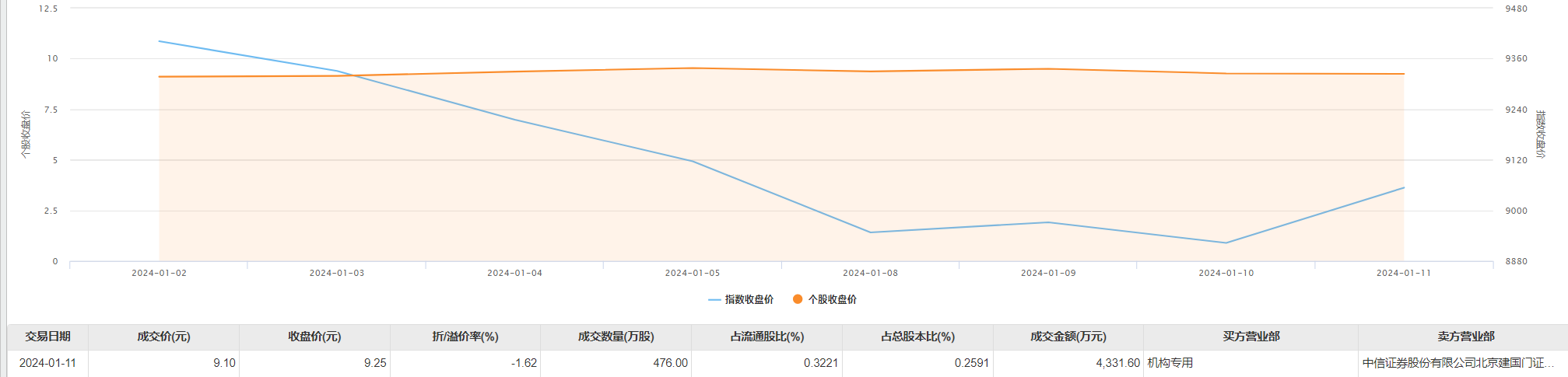 今日大宗交易成交476万股,成交额4331.6万元,占当日总成交额的27.34%,成交价9.1元,较市场收盘价折价1.62%。