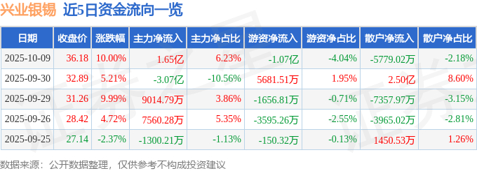 证券之星消息,兴业银锡10月9日涨停收盘,收盘价36.18元。该股于10点34分涨停,3次打开涨停,截止收盘封单资金为6257.01万元,占其流通市值0.1%。
