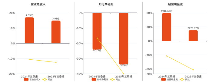 公司营业总收入为3.98亿元,在已披露的同业公司中排名第4,较去年同报告期营业总收入减少5696.63万元,同比较去年同期下降12.52%。归母净利润为-1.56亿元,在已披露的同业公司中排名第5,较去年同报告期归母净利润减少4462.53万元。经营活动现金净流入为2273.87万元,在已披露的同业公司中排名第3,较去年同报告期经营活动现金净流入减少3642.81万元,同比较去年同期下降61.57%。