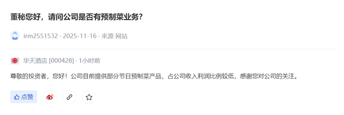 来源:深交所互动易【V观财报|华天酒店:公司目前提供部分节日预制菜产品】针对“公司是否有预制菜业务”相关问题,华天酒店11月18日在投资者互动平台表示,公司目前提供部分节日预制菜产品,占公司收入利润比例较低(中新经纬APP)