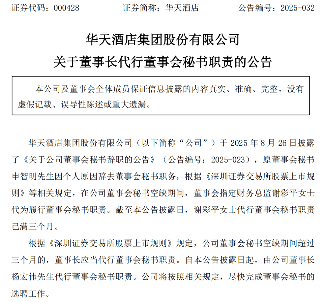 华天酒店11月26日晚间公告,公司于2025年8月26日披露了《关于公司董事会秘书辞职的公告》,原董事会秘书申智明因个人原因辞职,根据相关规定,在公司董事会秘书空缺期间,董事会指定财务总监谢彩平代为履行董事会秘书职责。谢彩平代行董事会秘书职责已满三个月。根据《深圳证券交易所股票上市规则》规定,公司董事会秘书空缺期间超过三个月的,董事长应当代行董事会秘书职责。自本公告披露日起,由公司董事长杨宏伟代行董事会秘书职责。
