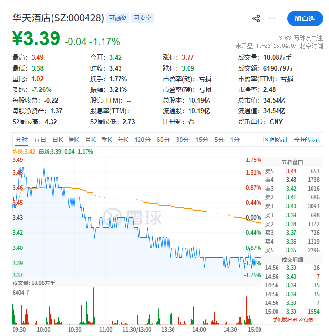 二级市场上,截至11月26日收盘,华天酒店跌1.17%,报3.39元/股,总市值34.54亿元。