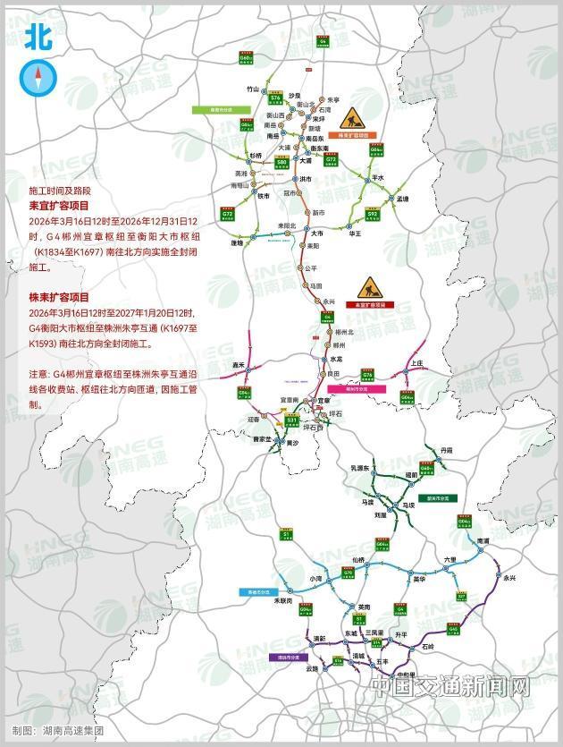 第一阶段(2026年3月16日12时至2026年12月31日12时):本阶段耒宜、株耒项目同步施工。郴州、衡阳两地共7个枢纽、14个收费站往北方向匝道实施管制,具体如下:
