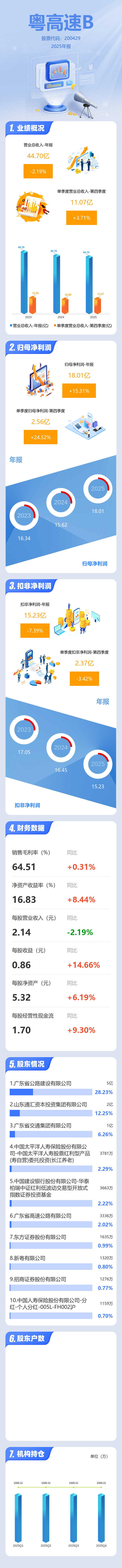 证券之星消息,粤高速B2025年年报显示,当年度公司主营收入44.7亿元,同比下降2.19%;归母净利润18.01亿元,同比上升15.31%;扣非净利润15.23亿元,同比下降7.39%;其中2025年第四季度,公司单季度主营收入11.07亿元,同比上升3.71%;单季度归母净利润2.56亿元,同比上升24.52%;单季度扣非净利润2.37亿元,同比下降3.42%;负债率46.98%,投资收益2.4亿元,财务费用7222.21万元,毛利率64.51%。