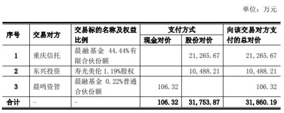 2023年4月25日,晨鸣纸业发布发行股份及支付现金购买资产暨关联交易报告书(草案)(修订稿)。晨鸣纸业拟以发行股份方式收购东兴投资持有的寿光美伦1.19%股权(对应寿光美伦5,721.0526万元出资额)、重庆信托持有的晨融基金44.44%有限合伙份额,晨鸣纸业全资子公司晨鸣投资拟以现金的方式收购晨鸣资管持有的晨融基金0.22%普通合伙份额。