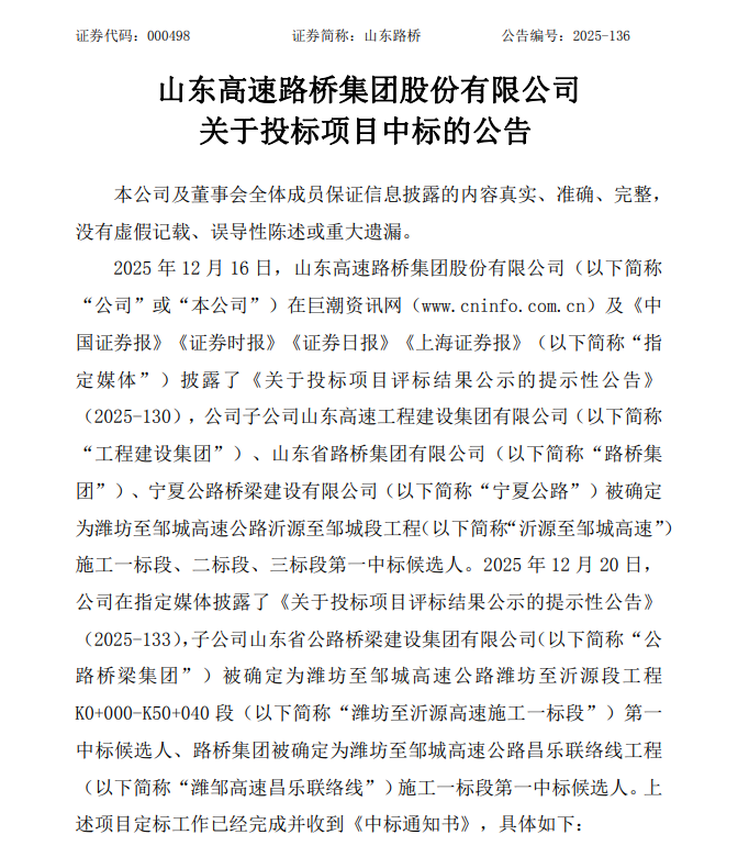 12月26日,山东路桥(000498.SZ)公告称,公司子公司在潍坊至邹城高速公路沂源至邹城段工程等项目中标,中标价合计约94.02亿元,占公司2024年度经审计营业收入的13.18%。若项目顺利实施,将对公司经营业绩产生积极影响。上述项目施工期均为1095日历天,公司将在施工工期内按照施工进度确认收入。本项目招标方山高基建公司为本公司控股股东山东高速集团有限公司的全资子公司,为本公司关联方。本项目所涉关联交易事项已经公司2025年第一次临时股东大会、2025年第三次临时股东会审议通过。