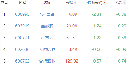 *ST皇台、金徽酒、广誉远、天佑德酒和舍得酒业位列涨幅榜后五位,涨幅分别为-2.31%、-1.24%、-1.22%、-0.66%和-0.57%。