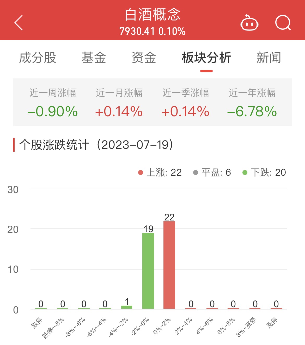 中国经济网北京7月19日讯今日,白酒概念板块整体涨幅0.10%,其中22只股票上涨,6只股票平盘,20只股票下跌。