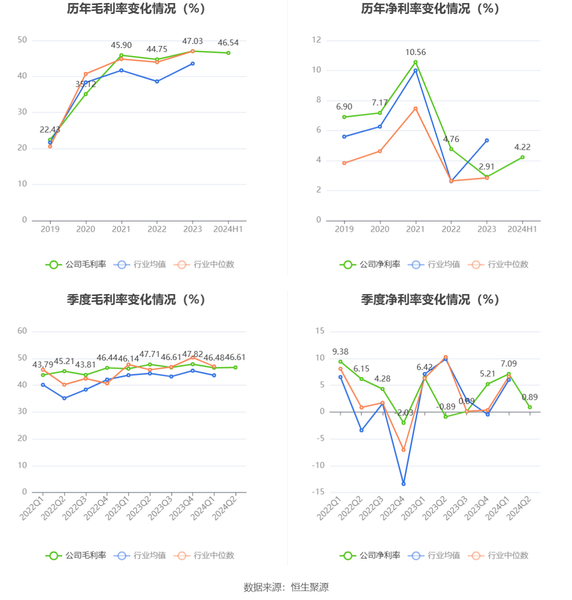 2024年上半年,公司毛利率为46.54%,同比下降0.30个百分点;净利率为4.22%,较上年同期上升1.08个百分点。从单季度指标来看,2024年第二季度公司毛利率为46.61%,同比下降1.10个百分点,环比上升0.13个百分点;净利率为0.89%,较上年同期上升1.78个百分点,较上一季度下降6.20个百分点。