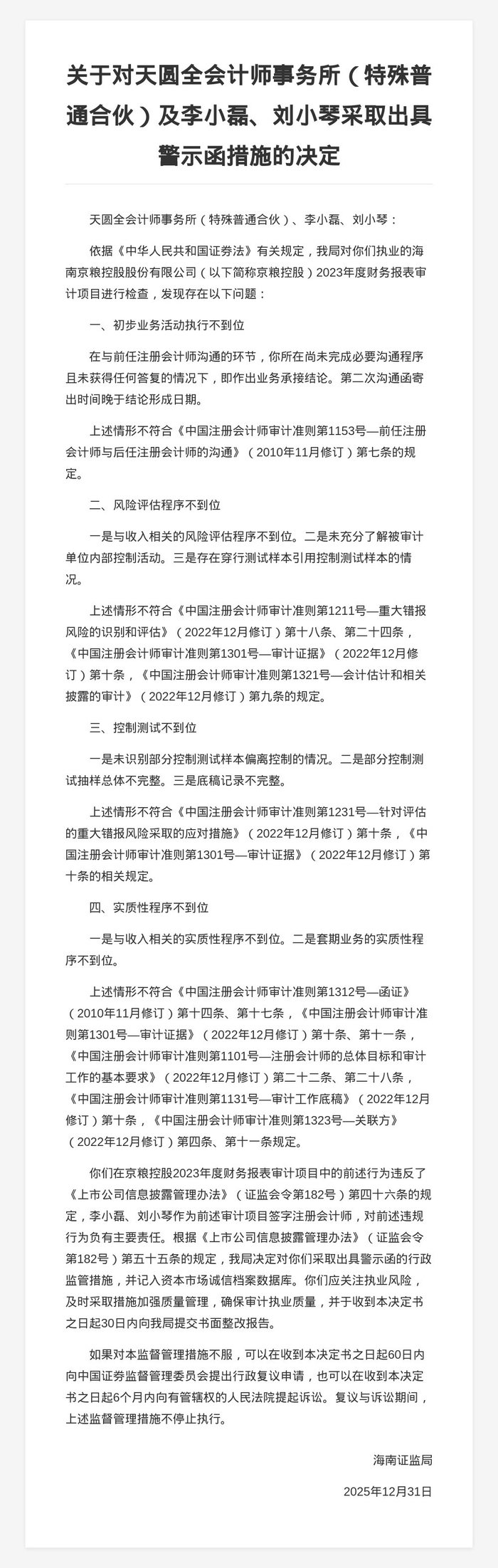 针对以上问题,海南证监局决定对天圆全会计师事务所(特殊普通合伙)、李小磊、刘小琴采取出具警示函的行政监管措施,并记入资本市场诚信档案数据库。