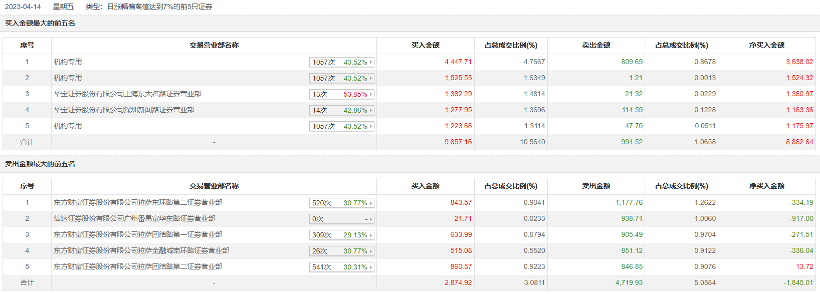具体来看,机构买入7196.91万元,卖出858.6万元,合计净买入6338.31万元。此外,华宝证券上海东大名路证券营业部、华宝证券深圳新闻路证券营业部分别买入1382.29万元、1277.95万元;东方财富证券拉萨东环路第二证券营业部、信达证券广州番禺富华东路证券营业部分别卖出1177.76万元、938.71万元。