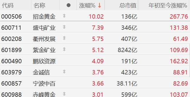 格隆汇10月15日|A股市场黄金概念股继续走强,其中,招金黄金涨停,盛屯矿业涨超7%,紫金矿业涨超5%,鹏欣资源涨4%。消息面上,金价继续上涨,现货黄金盘中涨至4193美元,再创历史新高。