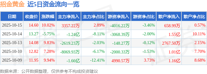证券之星消息,招金黄金10月15日涨停收盘,收盘价14.6元。该股于14点14分涨停,未打开涨停,截止收盘封单资金为7981.12万元,占其流通市值0.59%。