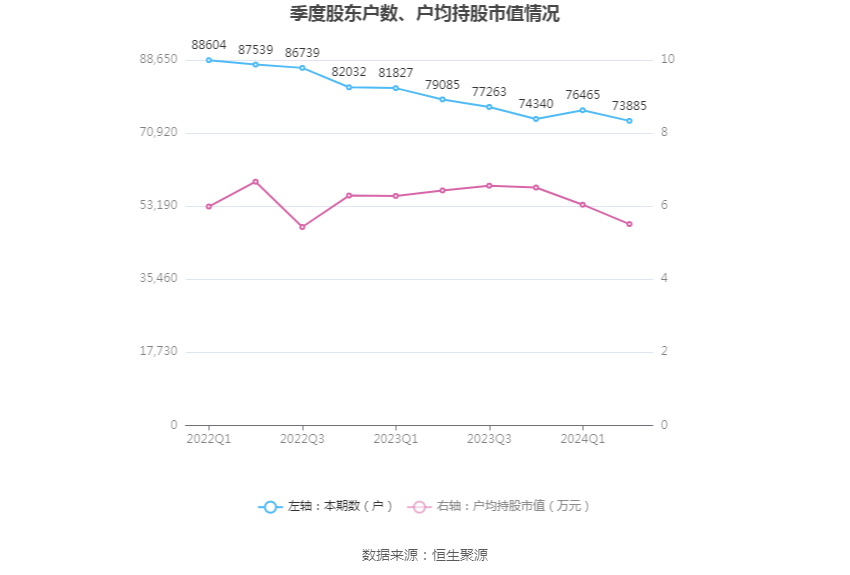 筹码集中度方面,截至2024年上半年末,公司股东总户数为7.39万户,较一季度末下降了2580户,降幅3.37%;户均持股市值由一季度末的6.04万元下降至5.51万元,降幅为8.77%。