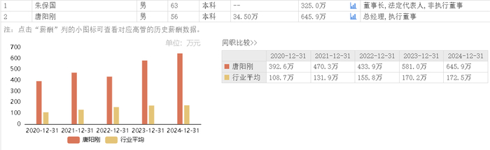 据东方财富网数据,丽珠集团总经理唐阳刚2022-2024年分别领薪433.9万、581万和645.9万元,三年间涨薪幅度达48.86%。董事长朱保国2024年领薪325万元。