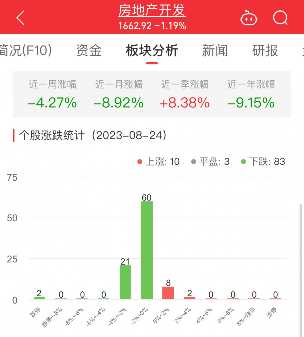 中国经济网北京8月24日讯 今日,房地产开发板块整体跌幅1.19%,其中10只股票上涨,3只股票平盘,83只股票下跌。
