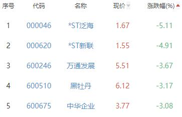 *ST泛海、*ST新联、万通发展、黑牡丹、中华企业位列涨幅榜后五位,涨幅分别为-5.11%、-4.91%、-3.67%、-3.17%、-3.08%。