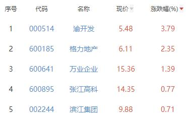 其中,渝开发、格力地产、万业企业、张江高科、滨江集团位列板块涨幅前五位,涨幅分别为3.79%、2.35%、1.39%、0.77%、0.71%。