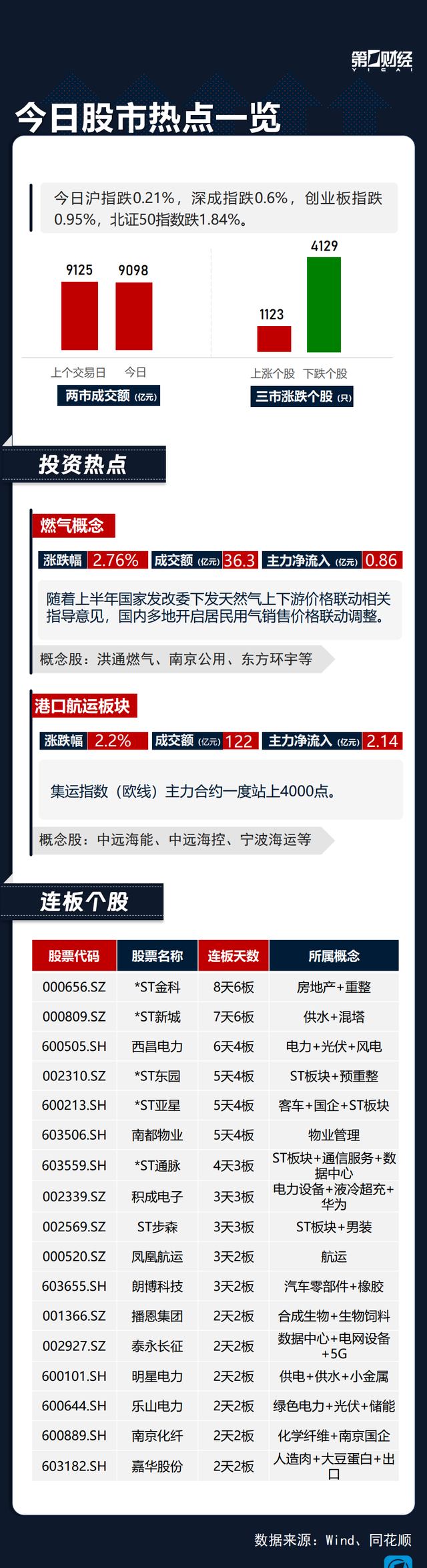 连板个股方面,电力设备股积成电子3连板,航运股凤凰航运3天2板。一图速览今日股市热点>>