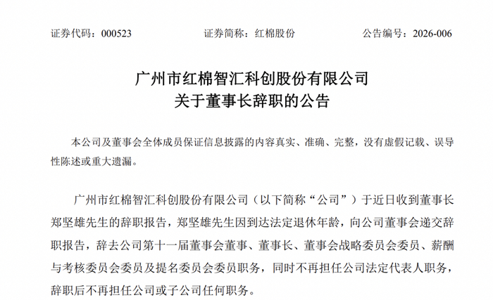 瑞财经 刘治颖 3月1日,红棉股份(SZ000523)公告,郑坚雄因到达法定退休年龄,向公司董事会递交辞职报告,辞去公司第十一届董事会董事、董事长、董事会战略委员会委员、薪酬与考核委员会委员及提名委员会委员职务,同时不再担任公司法定代表人职务,辞职后不再担任公司或子公司任何职务。