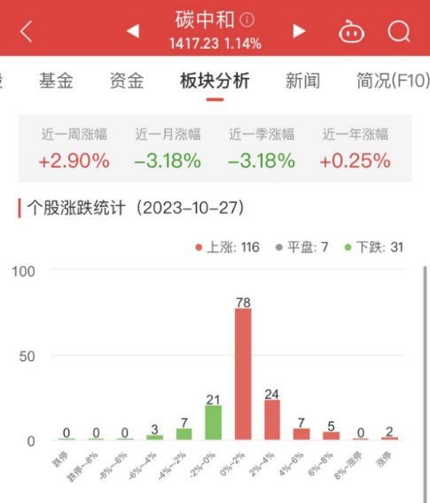 中国经济网北京10月27日讯今日,碳中和板块整体涨幅1.14%,其中116只股票上涨,7只股票平盘,31只股票下跌。