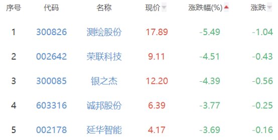 测绘股份、荣联科技、银之杰、诚邦股份、延华智能位列板块涨幅榜后五位,涨幅分别为-5.49%、-4.51%、-4.39%、-3.77%、-3.69%。