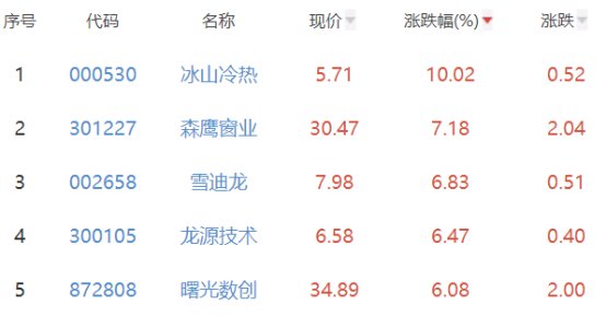 其中,冰山冷热、森鹰窗业、雪迪龙、龙源技术、曙光数创位列板块涨幅榜前五位,涨幅分别为10.02%、7.18%、6.83%、6.47%、6.08%。
