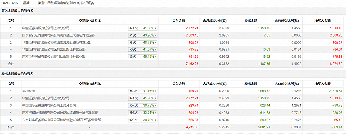 华金资本1月16日涨停,全天换手率达17.03%,振幅达13.5%。龙虎榜数据显示,营业部席位合计净买入3791.62万元。其中,机构买入159.21万元,卖出1688.72万元,合计净卖出1529.51万元。此外,华鑫证券上海分公司、国泰君安证券河源越王大道证券营业部分别买入2772.24万元、2303.13万元;华鑫证券上海分公司、中国国际金融上海分公司分别卖出1158.75万元、1028.44万元。