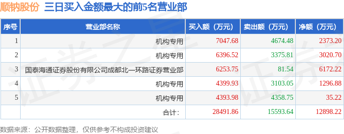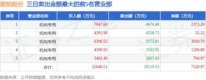 11月6日顺钠股份(000533)龙虎榜数据:机构净买入7520.97万元(3日)