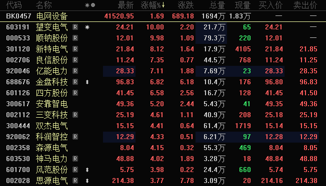 上证报中国证券网讯(邱思雨 记者 操子怡)2月12日早盘,电网设备概念股震荡走强,截至10时20分,望变电气、顺钠股份涨停,新特电气、金盘科技、安靠智电等多股涨超5%,双杰电气、神马电力、思源电气跟涨。