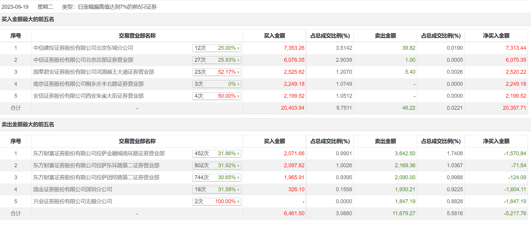 具体来看,中信建投证券北京东城分公司、中信证券北京总部证券营业部分别买入7353.26万元、6076.35万元;东方财富证券拉萨金融城南环路证券营业部、东方财富证券拉萨东环路第二证券营业部分别卖出3642.50万元、2169.36万元。