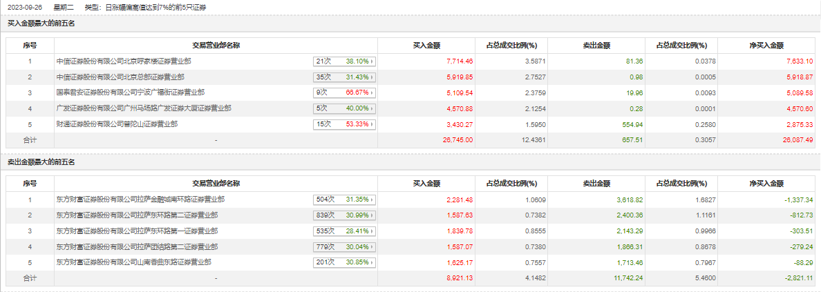 其中,中信证券北京呼家楼证券营业部、中信证券北京总部证券营业部分别买入7714.46万元、5919.85万元;东方财富证券拉萨金融城南环路证券营业部、东方财富证券拉萨东环路第二证券营业部分别卖出3618.82万元、2400.36万元。