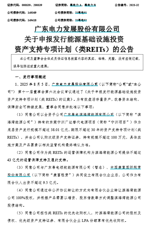 粤电力A拟发行不超38.01亿元能源基础设施投资类REITs