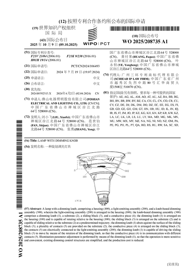 佛山照明公布国际专利申请:“一种旋钮调光灯具”