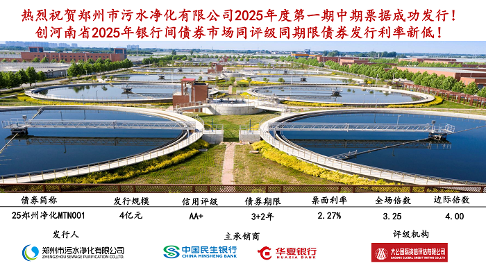 9月12日,中原环保全资子公司郑州市污水净化有限公司2025年度第一期中期票据在银行间市场成功发行。发行规模4亿元,发行期限3+2年,票面利率2.27%,全场倍数高达3.25倍,创下河南省2025年以来银行间债券市场同评级同期限债券发行利率新低。