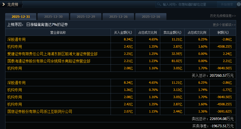 航天发展(000547)今日涨停,成交额179.32亿元,换手率35.77%,盘后龙虎榜数据显示,深股通专用席位买入8.34亿元并卖出11.21亿元,有3家机构专用席位净卖出3.18亿元。