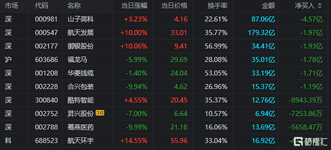 龙虎榜单日净卖出额前三为山子高科、航天发展、御银股份,分别为4.57亿元、1.97亿元、1.93亿元。