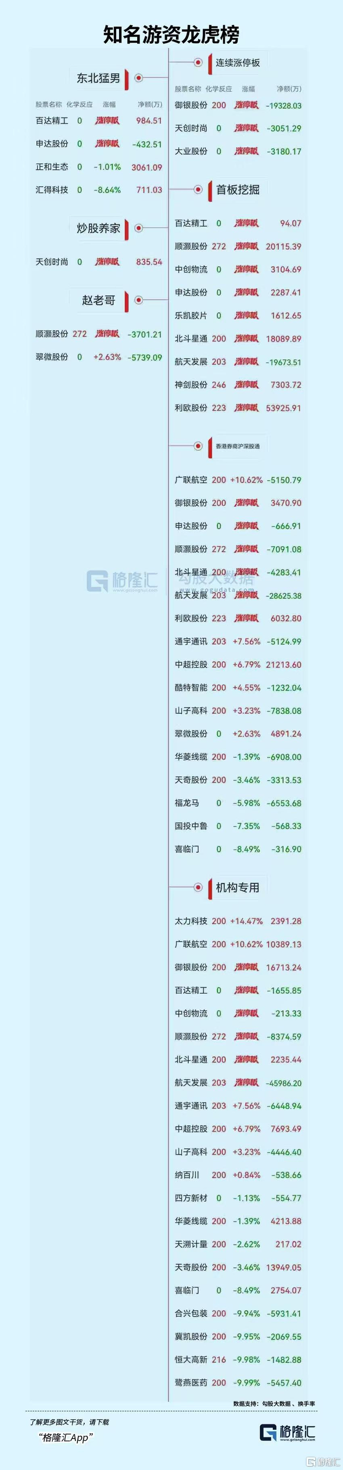 龙虎榜中涉及机构专用席位的个股中,当日净卖出额前三为航天发展、顺灏股份、合兴包装,分别为3.18亿元、8374.60万元、5931.41万元。