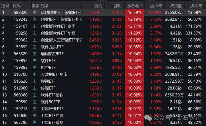 6)商业航天、AI应用动辄20cm甚至30cm大肉,相关ETF涨停潮也不足为怪。人工智能、软件、商业航天、卫星、传媒等上演ETF涨停潮。