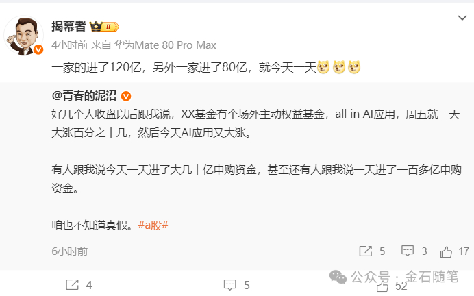 青春的泥沼说,某基金有个场外基金,AII in AI应用,周五一天涨了10%以上,今天又是10%以上,有人说几十亿,有人说上百亿。