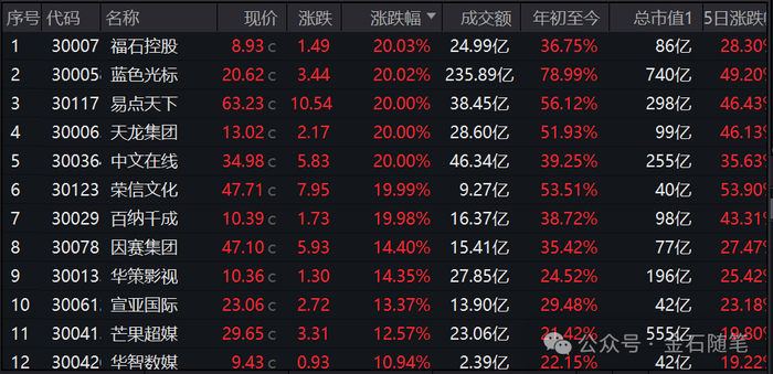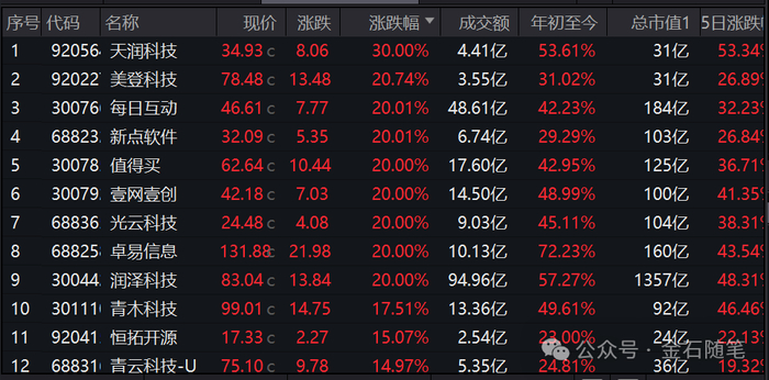 4)AI应用上演涨停潮。其实,相较于商业航天,AI应用涨幅更甚,天润科技30cm涨停,美登科技、每日互动、新店软件、壹网壹创、卓易信息、润泽科技等纷纷20cm涨停。