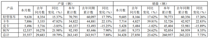 10月9日,江铃汽车(000550/200550)发布公告,2025年9月的产销情况显示,轻型客车的产量为9638辆,同比增加15.37%,销量为9605辆,同比增加17.62%。在卡车方面,产量为7886辆,同比增加47.82%,销量为7714辆,同比增加59.81%。皮卡的产量为5496辆,同比下降3.85%,销量为5428辆,同比下降1.02%。