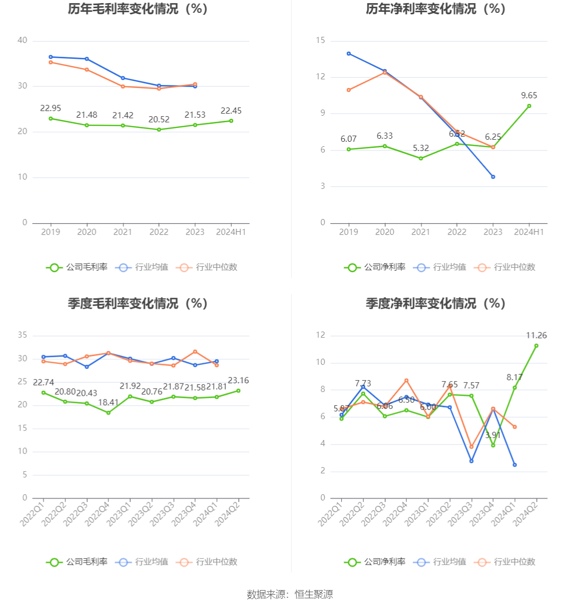 2024年上半年,公司毛利率为22.45%,同比上升1.11个百分点;净利率为9.65%,较上年同期上升2.82个百分点。从单季度指标来看,2024年第二季度公司毛利率为23.16%,同比上升2.40个百分点,环比上升1.35个百分点;净利率为11.26%,较上年同期上升3.61个百分点,较上一季度上升3.09个百分点。