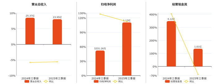 公司营业总收入为23.95亿元。归母净利润为1.13亿元,较去年同报告期归母净利润增加5987.93万元,实现5年连续上涨,同比较去年同期上涨112.32%。经营活动现金净流入为1.61亿元。