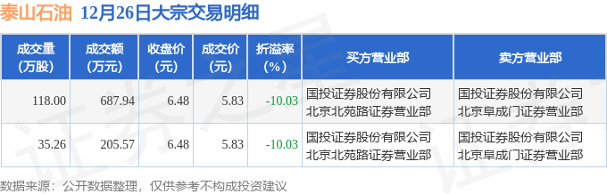 12月26日泰山石油现2笔折价10.03%的大宗交易 合计成交893.51万元