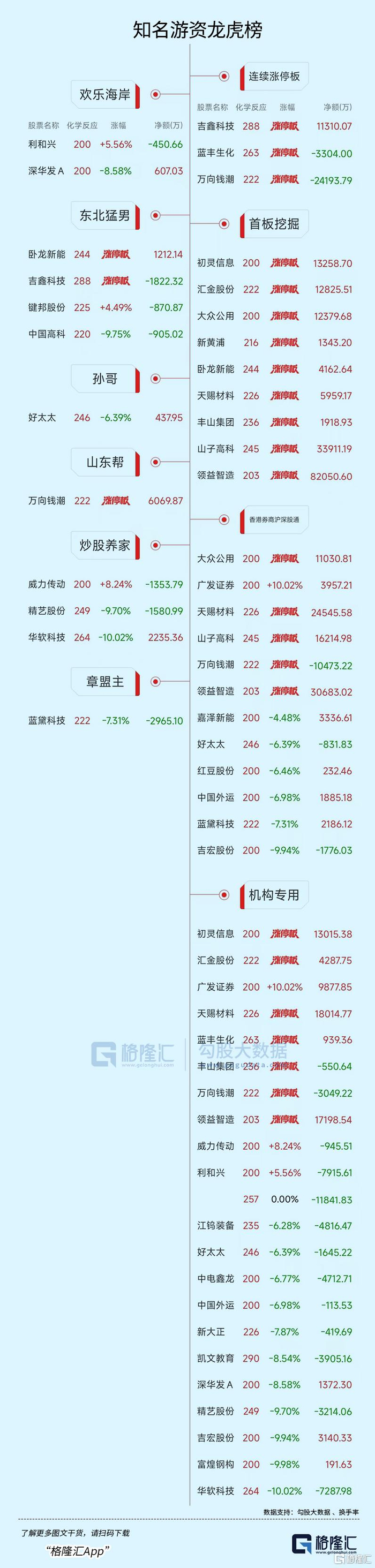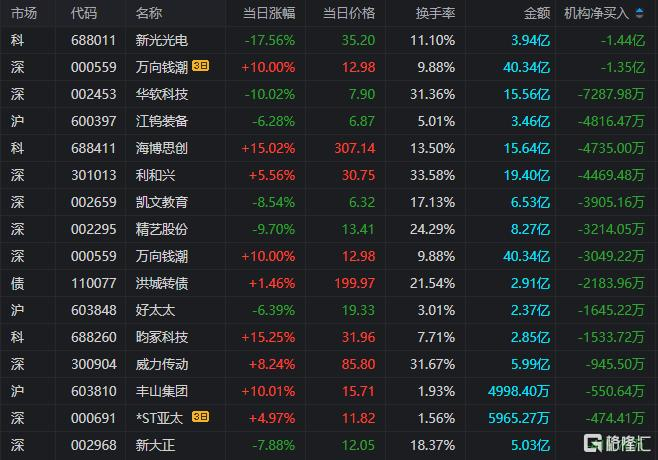 龙虎榜中涉及机构专用席位的个股中,当日净卖出额前三为华软科技、江钨装备、利和兴,分别为7287.98万元、4816.47万元、4469.48万元。